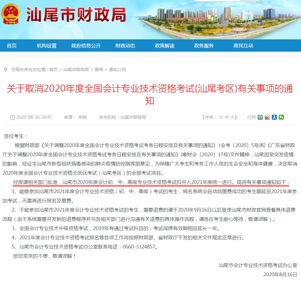 不能参加汕尾市2021年度会计专业技术资格考试的考生,需要退费的请于2020年9月16日以后登录汕尾市财政官网查看具体退费流程(由于系统需要开发新的退费程序并与各相关部门进行沟通有关退费的具体操作流程,请各位考生耐心等待,敬请谅解)。