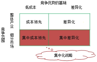 是针对某一特定购买群、产品细分市场或区域市场,采用成本领先或差异化以获取竞争优势的战略。 |