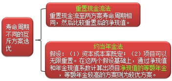 重置现金流法亦称期限相同法,运用这一方法的关键是假设两个方案的寿命期相同。