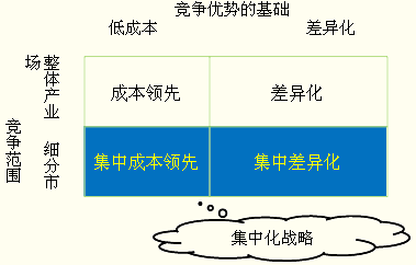 | 含义 | 是针对某一特定购买群、产品细分市场或区域市场,采用成本领先或差异化以获取竞争优势的战略。 |