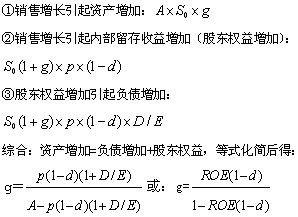 | 计算 | 部分负债与销售额存在稳定百分比 | A×S0×g-B×S0×g-P×S0×(1+g)×(1-d)=0求解g=? 或:g=P×(1-d)/[A-B-p×(1-d) |