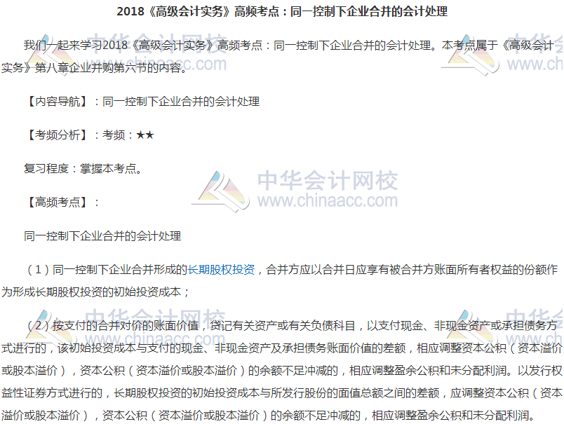 2018年高级会计师备考已经进入火热状态,为了让学员对高级会计师考试有更好地认识,正保会计网校为大家精心整理了高级会计职称考试高频考点。下面我们一起来学习2018高会《高级会计实务》高频考点:同一控制下企业合并的会计处理,快来学习吧。