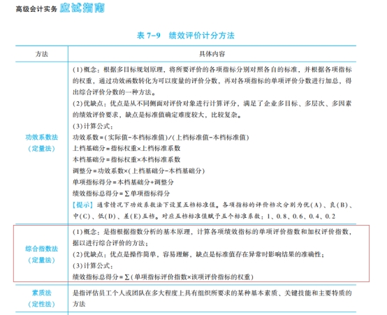 2023年高级会计实务《应试指南》P260的表7-6和P267的“(五)关键绩效指标的权重及目标值”。