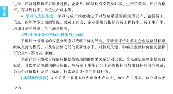 2023年高级会计实务《经典案例分析》P207的表7-3和P218的“(四)平衡计分卡指标的权重与目标值”。