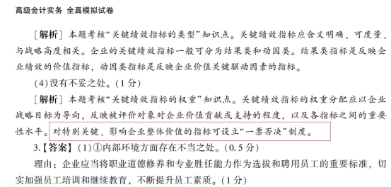 【点评】本题考核“绩效计划的制定(财务指标与非财务指标、定性指标与定量指标)、关键绩效指标的权重”知识点。该题目所涉及知识点在下列正保会计网校(www.fawtography.com)2023年高级职称《高级会计实务》辅导中均有体现:2023年高级会计实务《应试指南》P260的表7-6和P267的“(五)关键绩效指标的权重及目标值”,2023年高级会计实务《经典案例分析》P207的表7-3和P218的“(四)平衡计分卡指标的权重与目标值”,2023年高级会计实务《全真模拟试卷》P58的第2题。