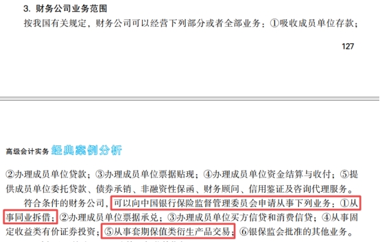 2023年高级会计实务《经典案例分析》P127的“3.财务公司业务范围”。
