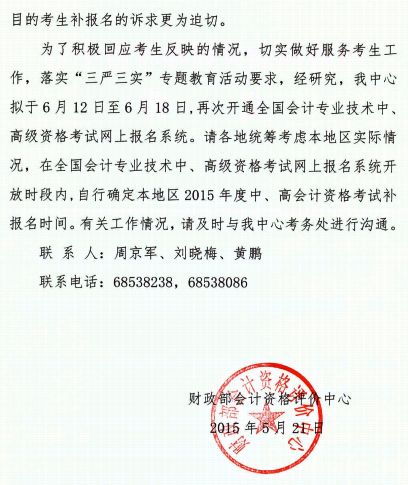 现将财政部会计资格评价中心《关于做好2015年度全国会计专业技术中、高级资格考试网上补报名工作的通知》(会评〔2015〕10号)转发给你们,并提出以下要求,请一并贯彻执行。
