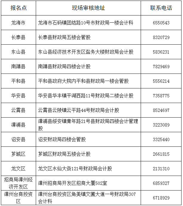 各县(市、区)、漳州台商投资区、招商局漳州经济开发区考生的报名及现场审核地点、联系电话如下: