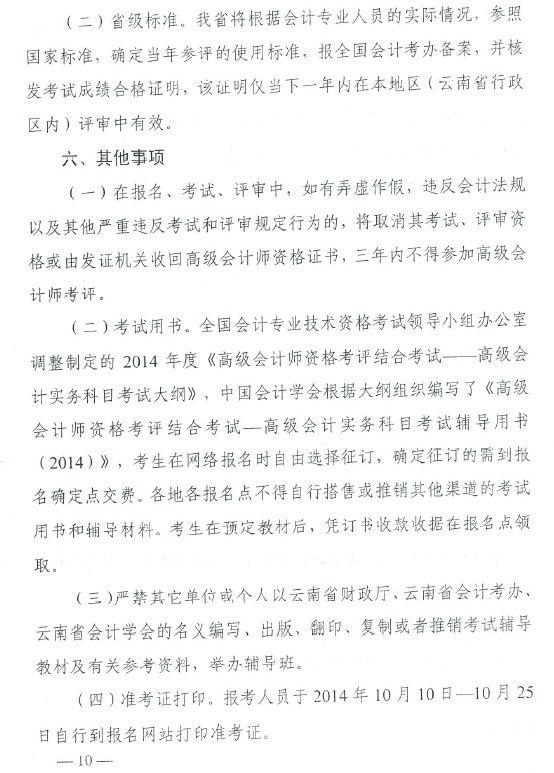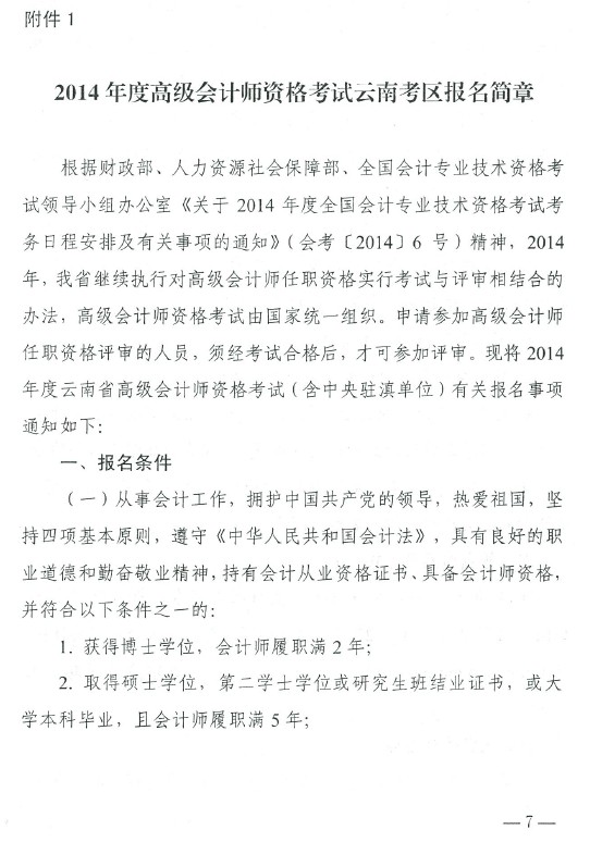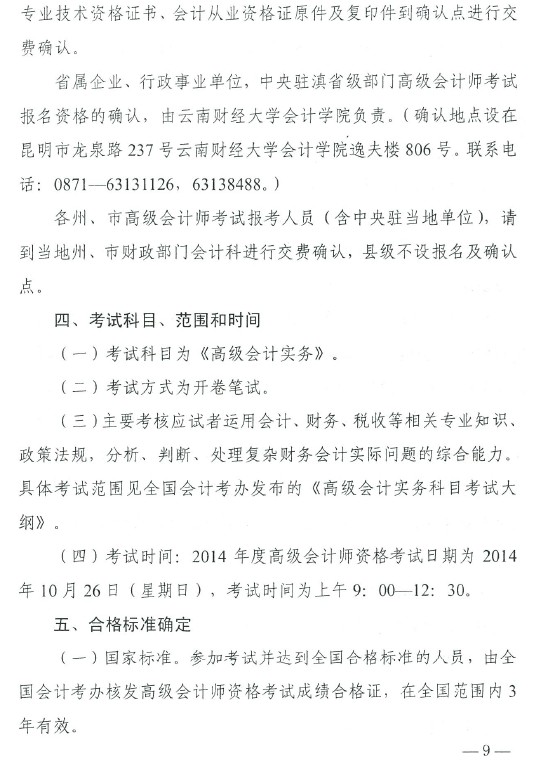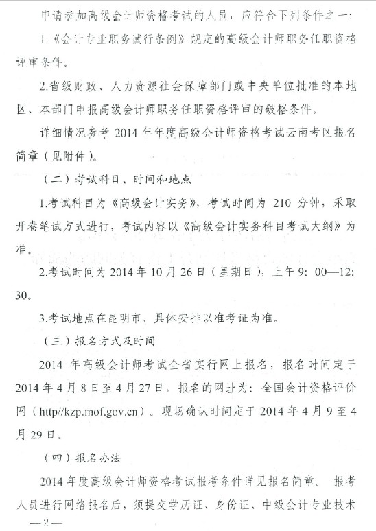 2014年云南高级会计师报名时间为4月8日至27日,2014年高级会计师考试全省实行网上报名,报名时间定于2014年4月8日27日,报名的网址为:全国会计资格评价网(http//kzp.mof.gov.cn)。现场确认时间定于2014年4月9日至4月29日。2014年高级会计师考试日期为10月26日。高级会计师考试科目为《高级会计实务》。
