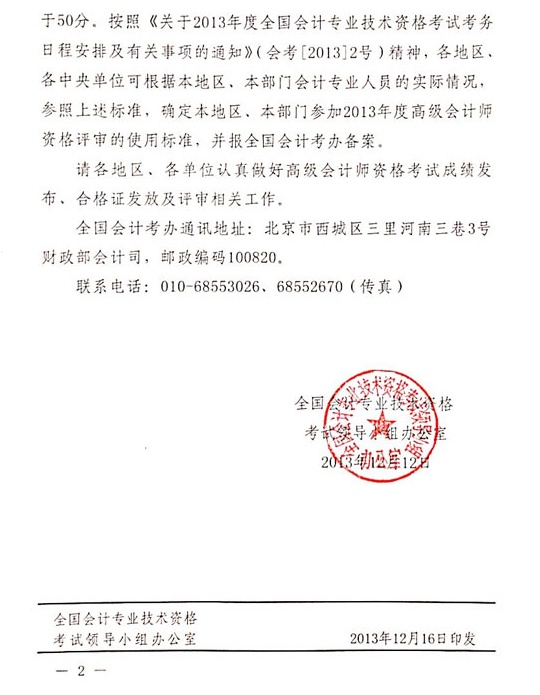 关于2013年度高级会计师资格考试合格标准等有关问题的通知