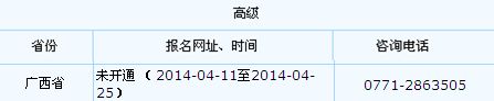 根据全国会计资格评价网()获悉,广西2014年高级会计师考试报名时间为2014年4月11日至2014年4月25日,目前广西2014年高级会计师考试报名入口暂未开通。