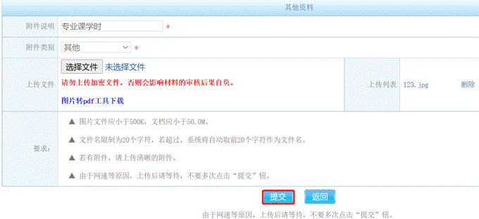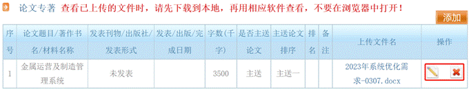 11.“论文、专著”栏:每篇论文或项目技术总结上传一个附件,论文附件包括期刊封面、目录及内容,外语论文还需附上中文翻译,项目技术总结附件包括单位盖章的项目技术总结内容和查重报告。