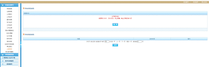 【评审进程查看】-[申报阶段]显示【受理号XXX,支付方式:网上缴费,截至日期还有XX天。】说明评委会已审核材料并通过,申报人可进行网上缴费。(此状态说明申报人系统审核已通过,等待评委会通知面试答辩即可。