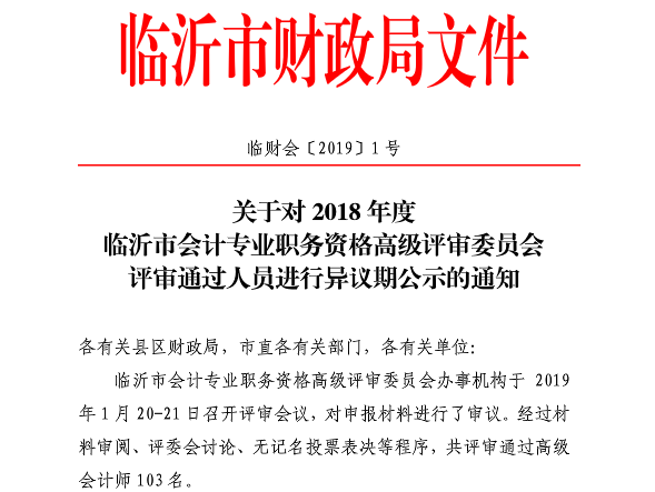 关于对2018年度临沂市会计专业职务资格高级评审委员会评审通过人员进行异议期公示的通知