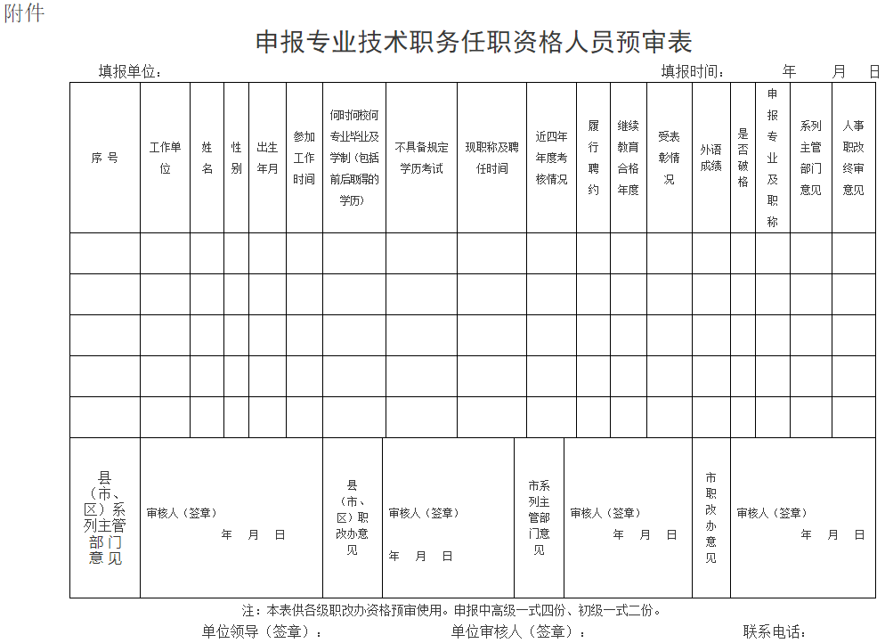 (一)《申报专业技术职务任职资格人员预审表》(一式四份)。