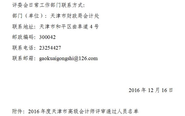 内容摘要:经天津市会计专业高级职务评审委员会评审,下列同志获得高级会计师资格,现予公式。公式时间从2016年12月16日至2016年12月22日止。若对下列同志取得资格有异议,请于公示期内向天津市会计专业高级职务评审委员会日常工作部门反映,反映情况的电话和书面材料要自报或签署真是姓名,联系电话:022-23254427。