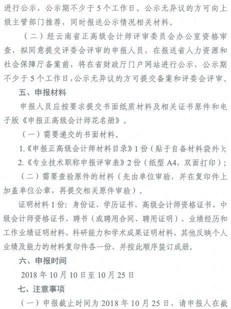 云南报送2018年正高级会计师职称资格评审材料的通知如下,申报时间:2018年10月10日至10月25日。