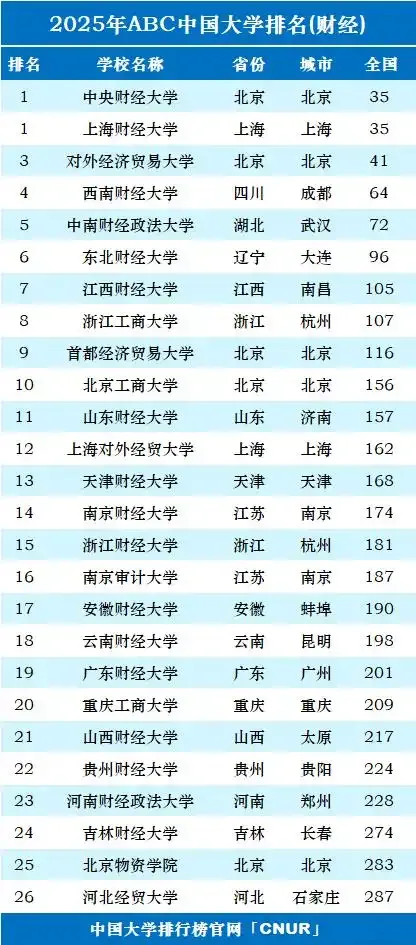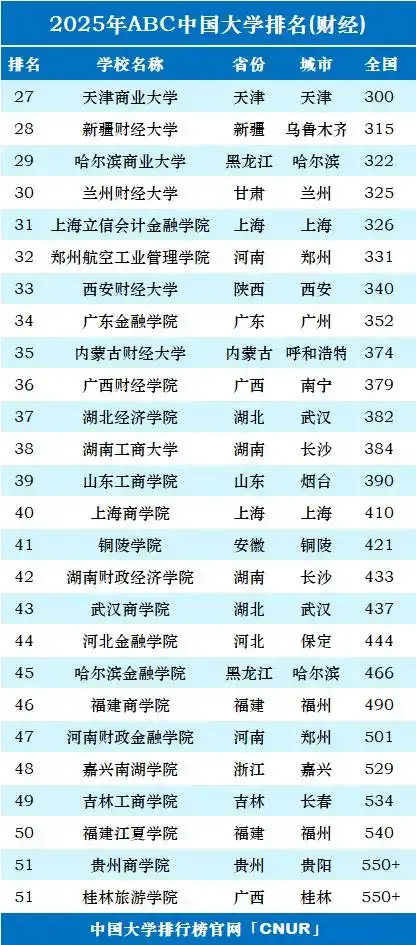 特点:东北财经大学位于大连,是东北地区财经教育的领军院校。其财政学、会计学、经济学等专业在国内享有盛誉。尽管地处东北,但其学科实力和行业影响力依然强劲,是东北地区唯一进入全国百强的财经类高校。