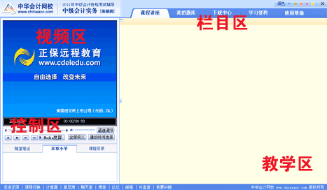 主要包括课程讲座效果切换(多种效果)、课程总目录、本章小节、相关栏目(课程讲义、课后作业、练习中心、考试中心、下载中心、答疑板、论坛、历届试题等)的按钮,点击相应链接即可进入相应栏目。