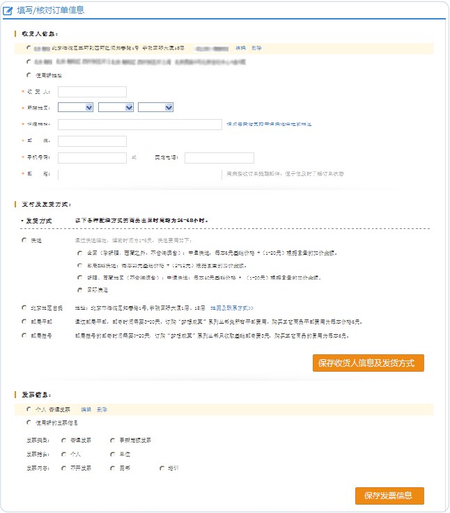 4、详细填写收货人信息、付款方式、发票信息、配送方式等信息。