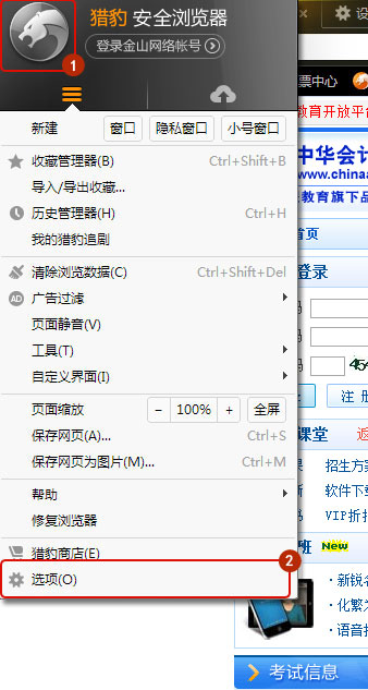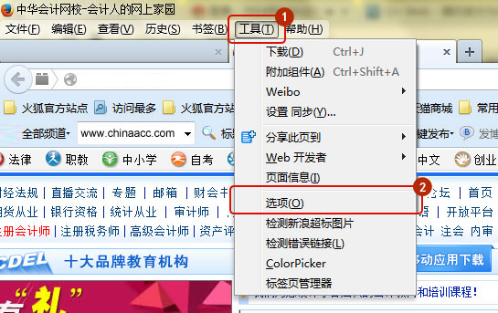 打开浏览器,先登录到正保会计网校的页面(这步很重要),点击右上角小扳手-选项,如图所示: