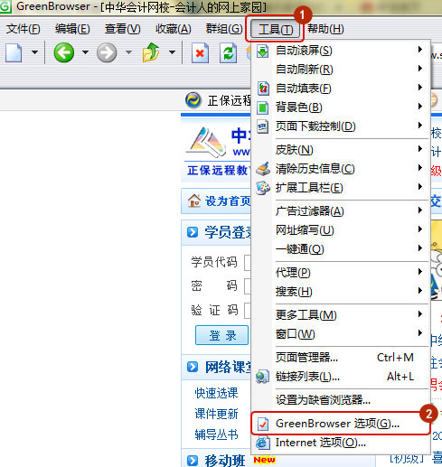 打开绿色浏览器-工具-GREENBROWSER选项,如图所示: