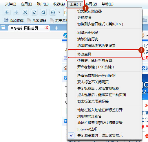 打开360浏览器, 工具(alt+t)-主页设置,如图所示: