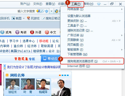 打开搜狗浏览器,点击菜单里的工具 - 搜狗高速浏览器选项,如图所示:
