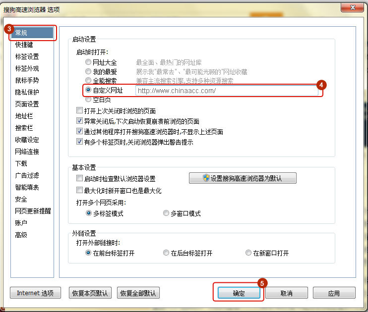 选择常规选项, 在启动设置里选择自定义网址,并输入www.fawtography.com,点击确定。