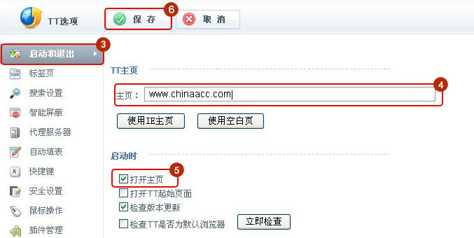 选择启动和退出,输入www.fawtography.com为主页,勾选启动时打开主页。最后别忘了点击保存按钮。