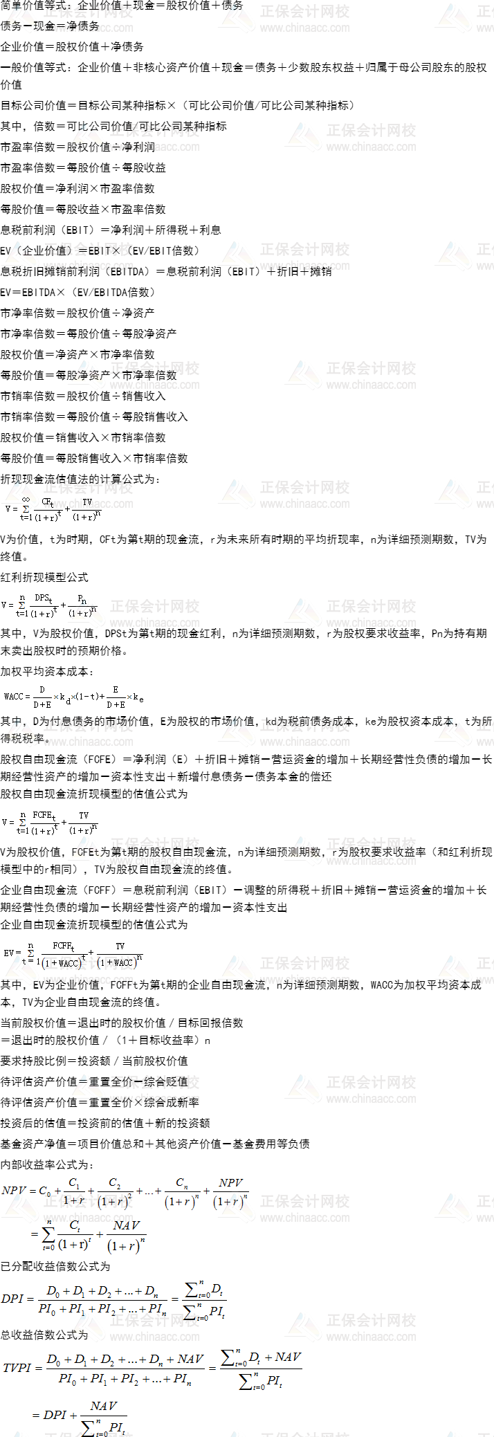 基金从业资格《私募股权投资》常用公式