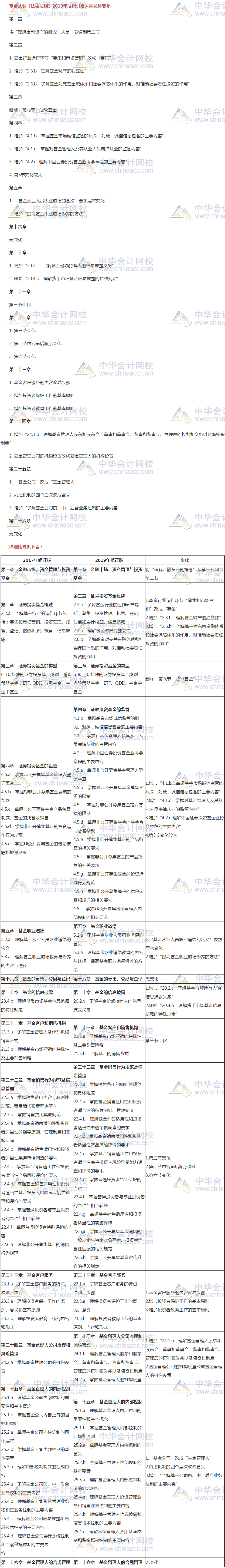 2019年9月份起,基金从业资格考试启用新大纲。为帮助广大考生尽快熟悉及了解2019年度修订版基金从业考试大纲调整变动情况,正保会计网校教学老师分别对各科目的考试大纲与2017年修订版考试大纲做了详细比对。总体来说变化在15%左右。其中,第16章、第26章没有变化,第2章、第3章、第4章、第22章、第25章变化较大。希望考生多加关注变化了的内容: