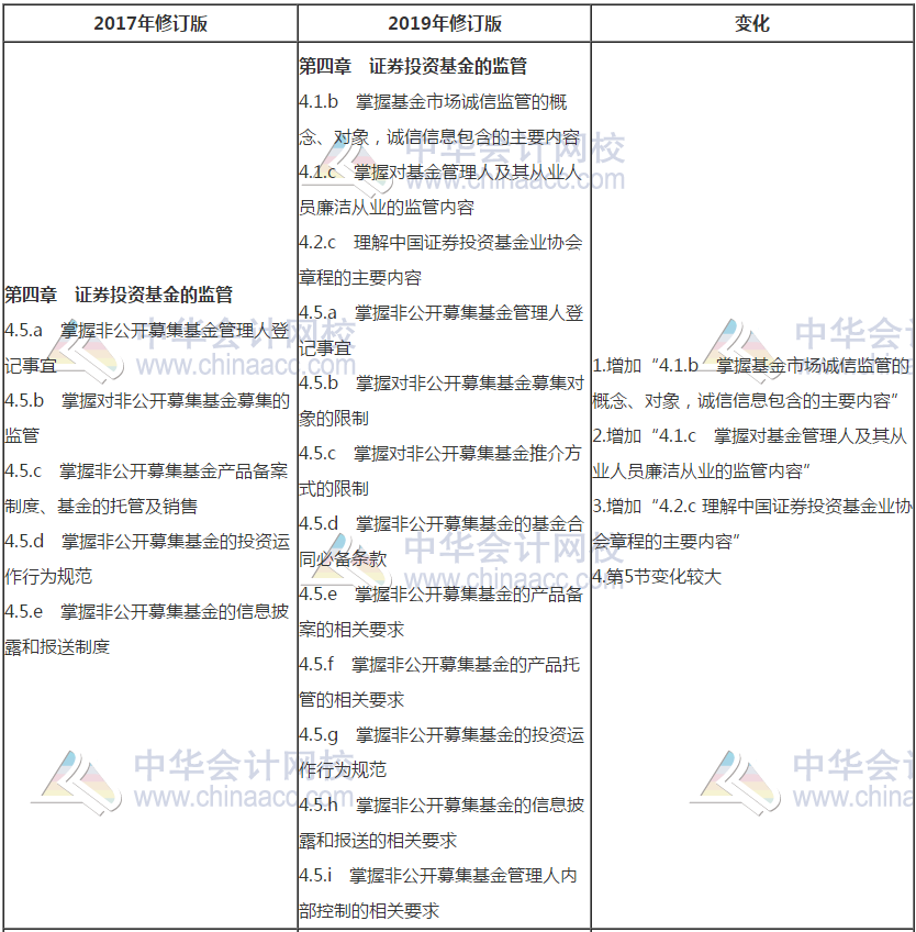 9月份基金从业报名7月22日起,本次为全国统一考试。这次考试启用基金从业考试新大纲——崭新崭新的2019年度修订版,考生在备考之前,要了解新大纲的变化在哪里,重点学习!下面是《法律法规》考试大纲第四章的变化:
