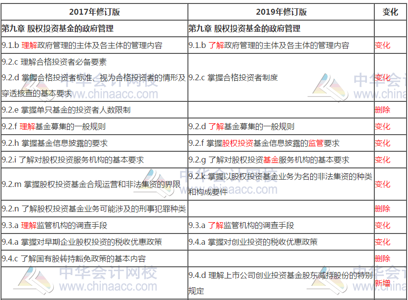 9月起基金从业资格考试启用2019的修订版新大纲,《私募股权投资基金基础知识》考试大纲变动了什么?下面是第九章新旧对比,供大家参考: