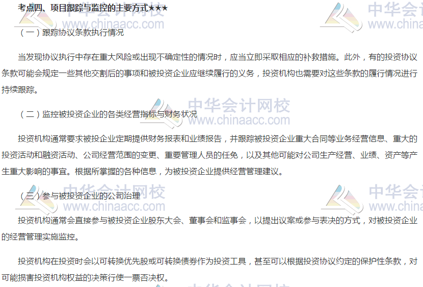 如何才能在金融市场站稳,自然是将基金从业证书拿下了。2019年基金从业资格考试,你准备好了吗?正保会计网校为您收集整理了基金从业资格考试《私募股权投资》第六章高频考点:项目跟踪与监控的方式,快来学习吧!