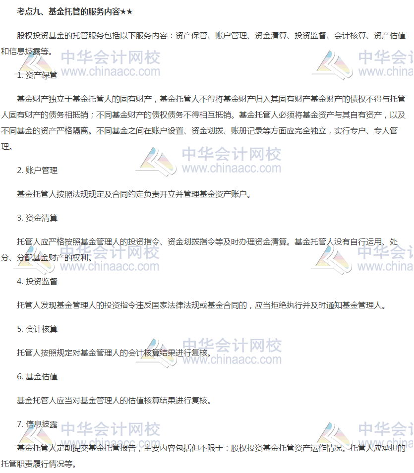 如何才能在金融市场站稳,自然是将基金从业证书拿下了。2019年基金从业资格考试,你准备好了吗?正保会计网校为您收集整理了基金从业资格考试《私募股权投资》第八章高频考点:基金托管的服务内容,快来学习吧!