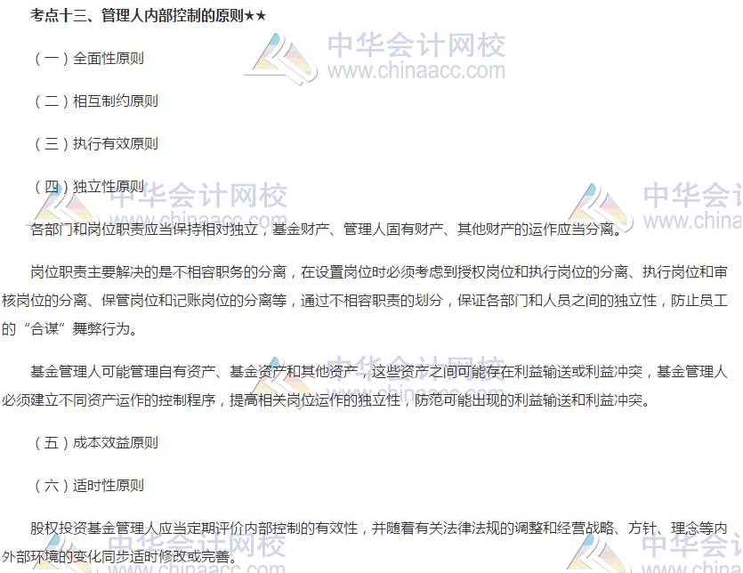 如何才能在金融市场站稳,自然是将基金从业证书拿下了。2019年基金从业资格考试,你准备好了吗?正保会计网校为您收集整理了基金从业资格考试《私募股权投资》第八章高频考点:管理人内部控制的原则,快来学习吧!