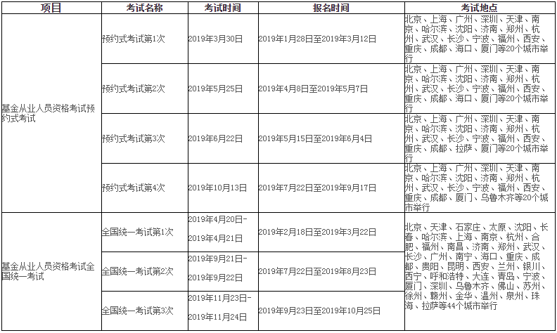 中国证券投资基金业协会现将2019年度基金从业人员资格考试计划公开发布。基金从业资格考试包含全国统一考试、预约式考试,考试计划可将根据实际情况进行调整,具体报名时间、考试时间、准考证打印时间和考试地点以当期考试公告为准。考生可通过中国证券投资基金业协会网站从业人员管理栏目考试平台查阅考试信息。