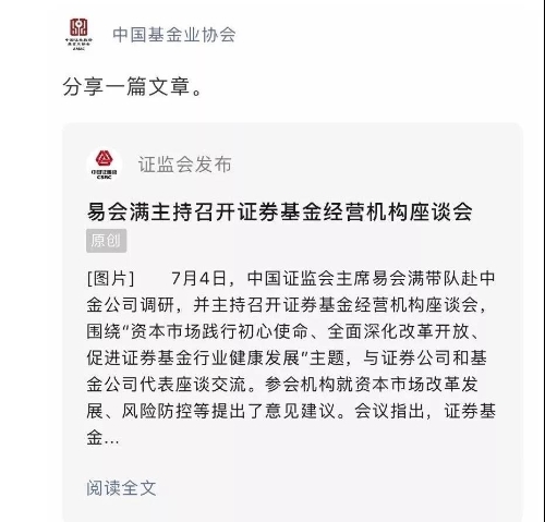7月4日,证券基金经营机构座谈会召开。易会满主席围绕“资本市场践行初心使命、全面深化改革开放、促进证券基金行业健康发展”主题与代表座谈。不忘初心,牢记使命,41家证券基金经营机构撰文新时代如何实现新作为,协会召开几十场座谈会,共同探索如何做好资本市场的“看门人”、直接融资的“服务商”、社会财富的“管理者”、资本市场的“稳定器”以及市场创新的“领头羊”,多措并举全面提升行业服务实体经济的能力。