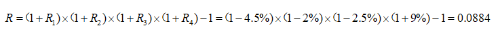 假设某基金每季度的收益率分别为4.5%、-2%、-2.5%、9%,则其时间加权收益率为( )。