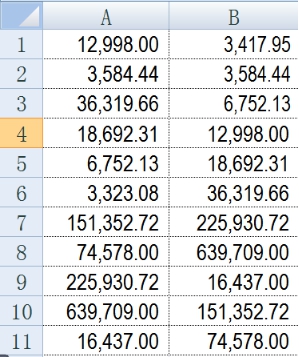 对A、B两列分别按照升序排序之后,我们将两列数据相减,相减后结果为零的,证明这两列的数据是相同的。由于A、B两列数值个数相同,又都是按照由小到大的顺序排列的,则相减之后不为零的即为两列不同的数据。操作如下图所示。
