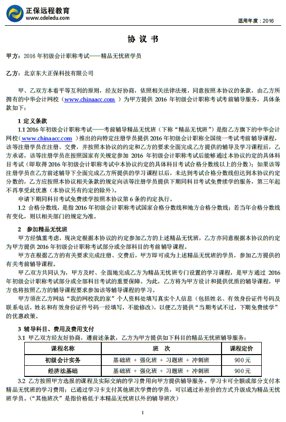 初级会计职称“精品无忧班”协议书
