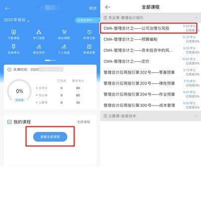 点击查看全部课程,即可浏览您的所有选课。选择章节、课程进行播放学习;