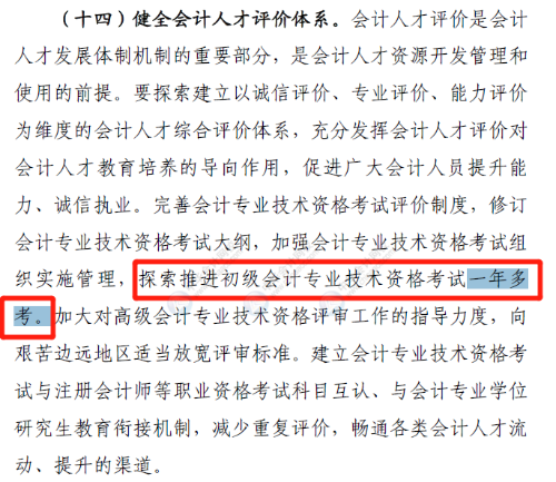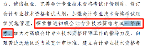 此外,关于初级会计职称考试一年多考,人社部此前在《关于深化会计人员职称制度改革的指导意见》中也曾明确指出: