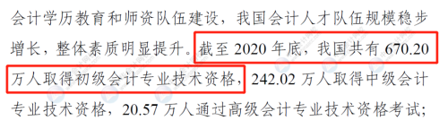 截至2020年底,我国共有670.20万人取得初级会计专业技术资格,242.02万人取得中级会计专业技术资格,20.57万人通过高级会计专业技术资格考试;