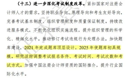 无独有偶,今年上半年,中注协在《注册会计师行业发展规划》中也明确表示:将研究适时调整CPA考试报名条件、考试时间、考试次数和考试方式!