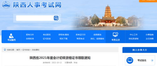 陕西人事考试网:2021年会计初级专业资格证书于2021年10月13日起邮寄