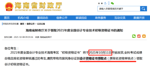 海南财政厅:海南考区“初级资格证书”将于2021年10月11日开始发放!