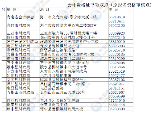 4 | 儋州市财政局 | 儋州市中兴大道财政大楼会计科 | 0898-23322145 |