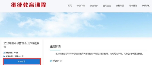 3、点击课程分类—进入中级“2025年度中级管理会计师继续教育”—点击"查看大纲学习"—观看所有继续教育课程—完成所有学习—进度条更新为“已完成”—系统弹出“继续教育学时证明”,保存学时证明。学员根据自身需求选择相应的年度进行学习。